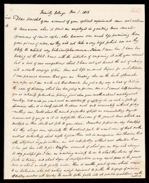 William Whewell, William Whewell, Letter, from William Whewell to Sir John Herschel, dated at Trinity College, 1 November 1818, HS/18/160, The Royal Society Archives, London, https://makingscience.royalsociety.org/items/hs_18_160/letter-from-william-whewell-to-sir-john-herschel-dated-at-trinity-college, accessed on 12 February 2026