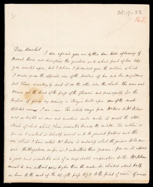 Autograph letter signed by sender. Discusses regions of the Alps and sends sketch of Monte Rosa. Informs John Frederick William Herschel of a brilliant student, G. B. Airy, who is constructing a calculating machine. Condolences on the death of William Herschel.