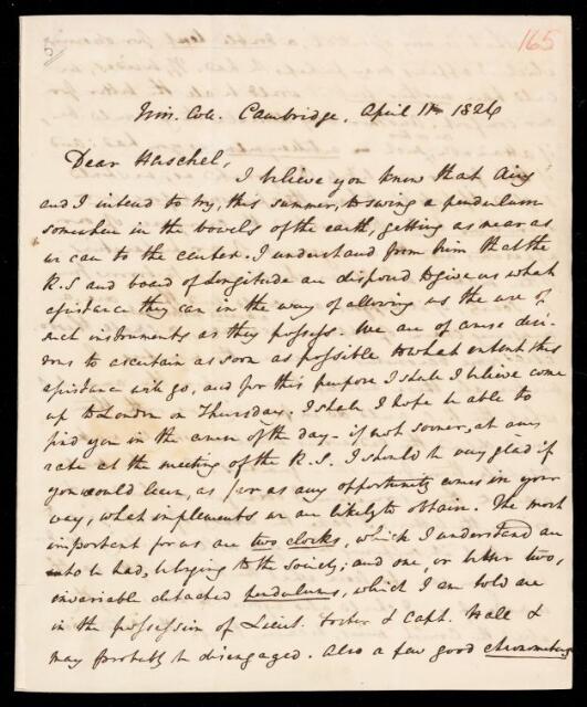 Autograph letter signed by sender. Describes plan to carry out pendulum experiments with G. B. Airy. Asks John Frederick William Herschel for help in borrowing instruments from the Royal Society [of London]