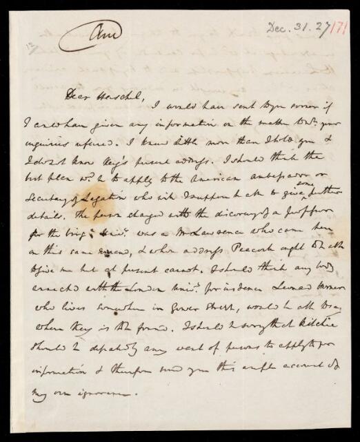 William Whewell, William Whewell, Letter, from William Whewell to Sir John Herschel, dated at Trinity College, 31 December 1827, HS/18/171, The Royal Society Archives, London, https://makingscience.royalsociety.org/items/hs_18_171/letter-from-william-whewell-to-sir-john-herschel-dated-at-trinity-college, accessed on 12 February 2026