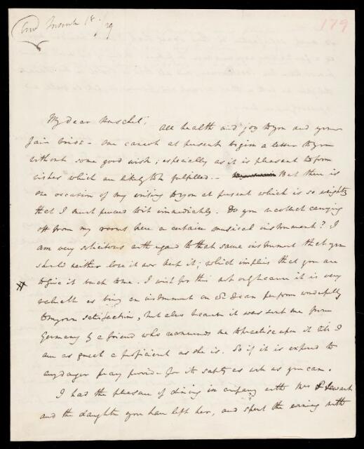 Autograph letter signed by sender. Asks John Frederick William Herschel to return a musical instrument he had borrowed. Mentions dining with Mrs. Alexander Stewart [John Frederick William Herschel's new mother-in-law]. Asks John Frederick William Herschel to look over a sheet of chemical elements to be used as a basis for a mineralogical classification. Invites John Frederick William Herschel and his bride to visit William Whewell in Cambridge.