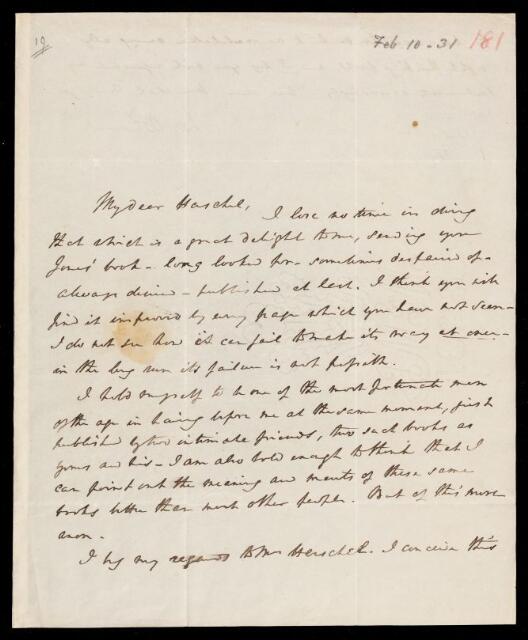 William Whewell, William Whewell, Letter, from William Whewell to Sir John Herschel, dated at Trinity College, 10 February 1831, HS/18/181, The Royal Society Archives, London, https://makingscience.royalsociety.org/items/hs_18_181/letter-from-william-whewell-to-sir-john-herschel-dated-at-trinity-college, accessed on 12 February 2026