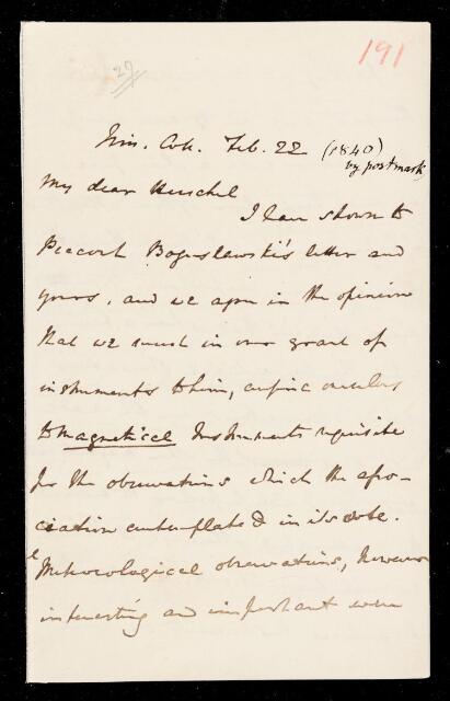 William Whewell, William Whewell, Letter, from William Whewell to Sir John Herschel, dated at Trinity College, 22 February 1840, HS/18/191, The Royal Society Archives, London, https://makingscience.royalsociety.org/items/hs_18_191/letter-from-william-whewell-to-sir-john-herschel-dated-at-trinity-college, accessed on 12 February 2026