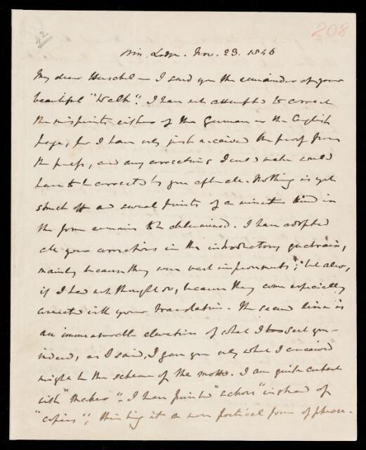 Autograph letter signed by sender. Suggests final revisions to John Frederick William Herschel's hexameter translation of Friedrich Schiller's 'The Walk.' Informs John Frederick William Herschel of the other authors of verses in the volume.