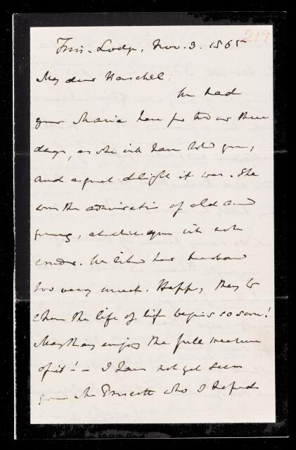 Autograph letter signed by sender. Delighted by visit from John Frederick William Herschel's daughter Maria and her new husband. Looks forward to meeting Mr. Prescott [see John Frederick William Herschel's 1865-10-22].