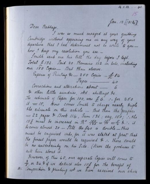 John Frederick William Herschel, Copy of incomplete letter, from Sir John Herschel to Charles Babbage, 12 January 1814, HS/20/15, The Royal Society Archives, London, https://makingscience.royalsociety.org/items/hs_20_15/copy-of-incomplete-letter-from-sir-john-herschel-to-charles-babbage, accessed on 08 December 2025
