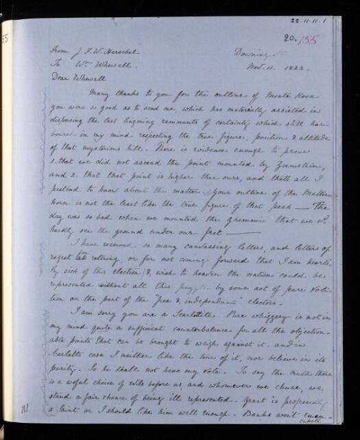 John Frederick William Herschel, Copy letter, from Sir John Herschel to William Whewell, dated at Downing St., 11 November 1822, HS/20/155, The Royal Society Archives, London, https://makingscience.royalsociety.org/items/hs_20_155/copy-letter-from-sir-john-herschel-to-william-whewell-dated-at-downing-st, accessed on 12 February 2026