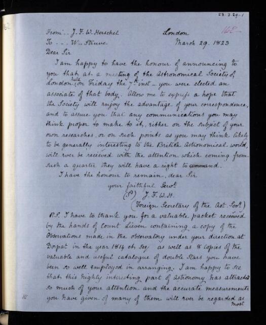 John Frederick William Herschel, Copy letter, from Sir John Herschel to Wilhelm Struve, 29 March 1823, HS/20/162, The Royal Society Archives, London, https://makingscience.royalsociety.org/items/hs_20_162/copy-letter-from-sir-john-herschel-to-wilhelm-struve, accessed on 22 April 2026