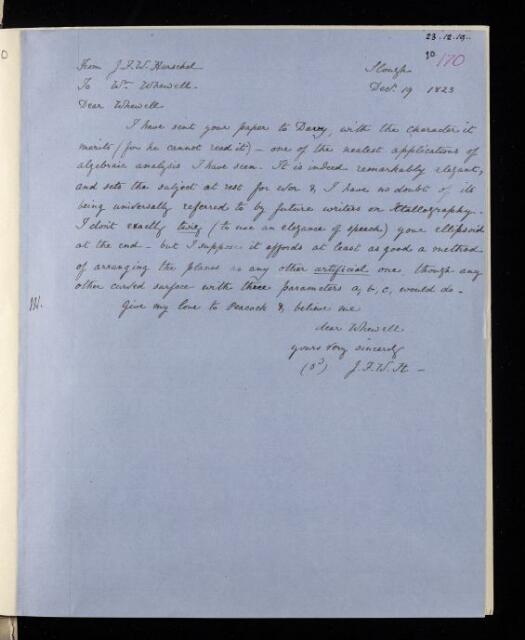 John Frederick William Herschel, Copy letter, from Sir John Herschel to William Whewell, 19 December 1823, HS/20/170, The Royal Society Archives, London, https://makingscience.royalsociety.org/items/hs_20_170/copy-letter-from-sir-john-herschel-to-william-whewell, accessed on 11 February 2026