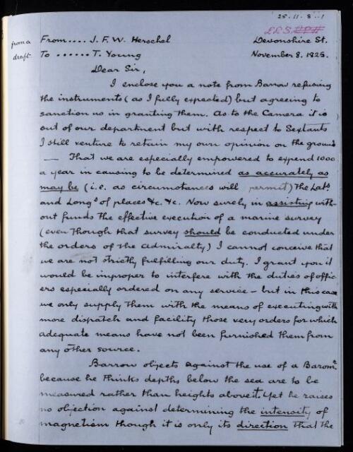 John Frederick William Herschel, Copy of draft letter, from Sir John Herschel to Thomas Young, dated at 56 Devonshire St., 8 November 1825, HS/20/223, The Royal Society Archives, London, https://makingscience.royalsociety.org/items/hs_20_223/copy-of-draft-letter-from-sir-john-herschel-to-thomas-young-dated-at-56-devonshire-st, accessed on 08 December 2025
