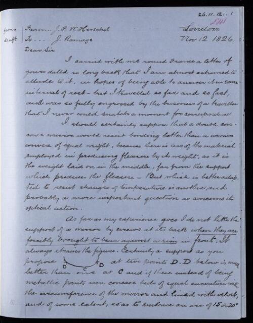 John Frederick William Herschel, Copy of draft letter, from Sir John Herschel to John Ramage, dated at London, 12 November 1826, HS/20/241, The Royal Society Archives, London, https://makingscience.royalsociety.org/items/hs_20_241/copy-of-draft-letter-from-sir-john-herschel-to-john-ramage-dated-at-london, accessed on 11 March 2026