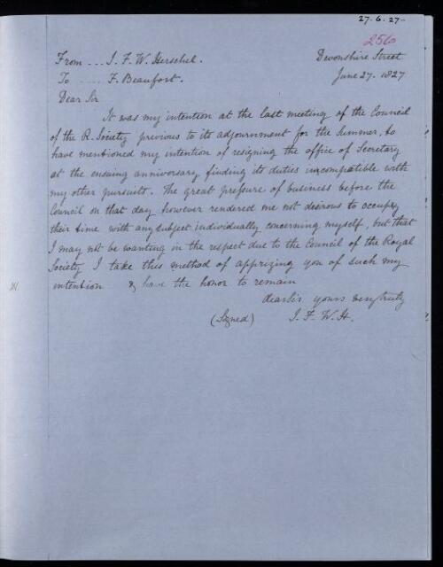 John Frederick William Herschel, Sir; John Frederick William Herschel, Copy letter, from Sir John Herschel to Francis Beaufort, dated at Devonshire St., 27 June 1827, HS/20/256, The Royal Society Archives, London, https://makingscience.royalsociety.org/items/hs_20_256/copy-letter-from-sir-john-herschel-to-francis-beaufort-dated-at-devonshire-st, accessed on 16 November 2025