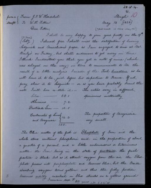 John Frederick William Herschel, Copy of letter, from Sir John Herschel to William Henry Fitton, dated at Slough, 14 May 1828, HS/21/10, The Royal Society Archives, London, https://makingscience.royalsociety.org/items/hs_21_10/copy-of-letter-from-sir-john-herschel-to-william-henry-fitton-dated-at-slough, accessed on 17 January 2026