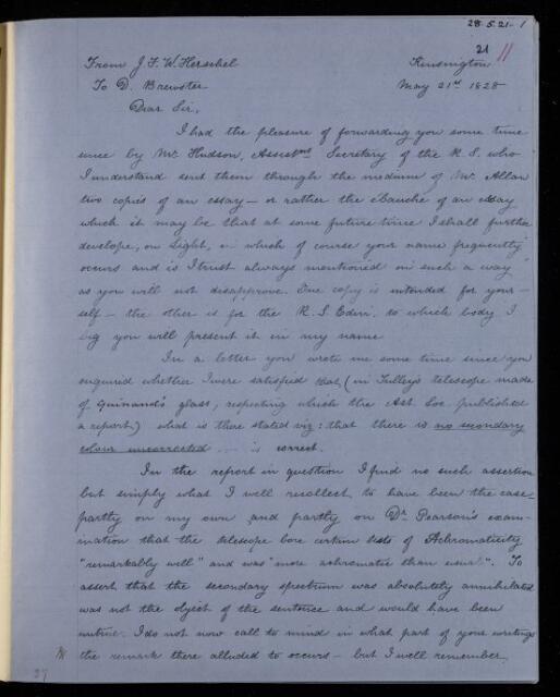 John Frederick William Herschel, Copy letter, from Sir John Herschel to David Brewster, dated at Kensington, 21 May 1828, HS/21/11, The Royal Society Archives, London, https://makingscience.royalsociety.org/items/hs_21_11/copy-letter-from-sir-john-herschel-to-david-brewster-dated-at-kensington, accessed on 19 January 2026