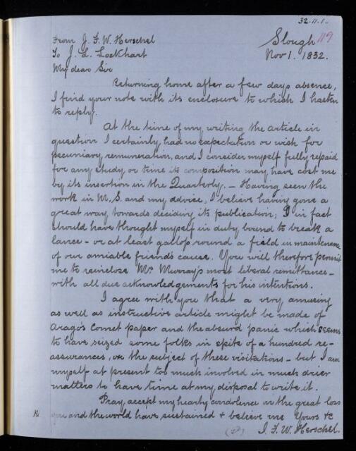 John Frederick William Herschel, Copy of letter, from Sir John Herschel to John Gibson Lockhart, dated at Slough, 1 November 1832, HS/21/119, The Royal Society Archives, London, https://makingscience.royalsociety.org/items/hs_21_119/copy-of-letter-from-sir-john-herschel-to-john-gibson-lockhart-dated-at-slough, accessed on 12 December 2025