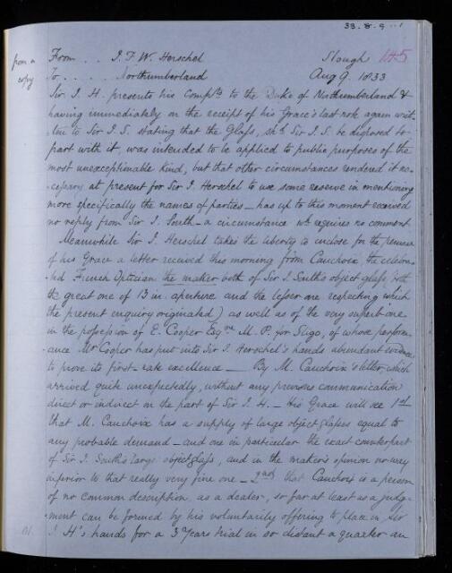 John Frederick William Herschel, Copy letter, from Sir John Herschel to Hugh Percy (3rd Duke of Northumberland), dated at Slough, 9 August 1833, HS/21/145, The Royal Society Archives, London, https://makingscience.royalsociety.org/items/hs_21_145/copy-letter-from-sir-john-herschel-to-hugh-percy-3rd-duke-of-northumberland-dated-at-slough, accessed on 09 February 2026