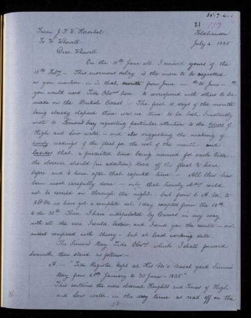 Copy of letter, copied as part of the correspondence project led by Colonel John Herschel FRS following the death of his father. Describes in detail efforts, only partially successful, made by Thomas Maclear and John Frederick William Herschel to record tidal data at Simon's Bay and Table Bay. Gives some interpretation of the data.