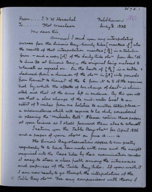 John Frederick William Herschel, Sir; John Frederick William Herschel, Copy letter, from Sir John Herschel to Thomas Maclear, dated at Feldhausen, 8 July 1835, HS/21/180, The Royal Society Archives, London, https://makingscience.royalsociety.org/items/hs_21_180/copy-letter-from-sir-john-herschel-to-thomas-maclear-dated-at-feldhausen, accessed on 09 November 2025