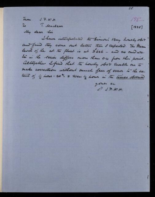 John Frederick William Herschel, Sir; John Frederick William Herschel, Copy letter, from Sir John Herschel to Thomas Maclear, dated at [Feldhausen], 1835-7, HS/21/192, The Royal Society Archives, London, https://makingscience.royalsociety.org/items/hs_21_192/copy-letter-from-sir-john-herschel-to-thomas-maclear-dated-at-feldhausen, accessed on 07 November 2025