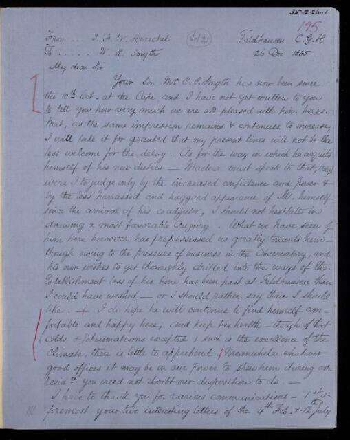 John Frederick William Herschel, Sir; John Frederick William Herschel, Copy letter, from Sir John Herschel to William Henry Smyth, dated at Feldhausen, Cape of Good Hope, 26 October 1835, HS/21/195, The Royal Society Archives, London, https://makingscience.royalsociety.org/items/hs_21_195/copy-letter-from-sir-john-herschel-to-william-henry-smyth-dated-at-feldhausen-cape-of-good-hope, accessed on 07 November 2025