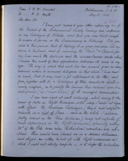 John Frederick William Herschel, Copy letter, from Sir John Herschel to William Henry Smyth, dated at Feldhausen, Cape of Good Hope, 31 May 1836, HS/21/207, The Royal Society Archives, London, https://makingscience.royalsociety.org/items/hs_21_207/copy-letter-from-sir-john-herschel-to-william-henry-smyth-dated-at-feldhausen-cape-of-good-hope, accessed on 10 February 2026