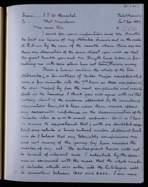 John Frederick William Herschel, Sir; John Frederick William Herschel, Copy letter, from Sir John Herschel to Thomas Maclear, dated at Feldhausen, 30 July 1837, HS/21/226, The Royal Society Archives, London, https://makingscience.royalsociety.org/items/hs_21_226/copy-letter-from-sir-john-herschel-to-thomas-maclear-dated-at-feldhausen, accessed on 14 November 2025