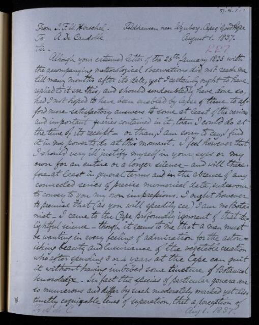 John Frederick William Herschel, Sir; John Frederick William Herschel, Copy of draft letter, from Sir John Herschel to Alphonse Candolle, dated at Feldhausen, 1 August 1837, HS/21/227, The Royal Society Archives, London, https://makingscience.royalsociety.org/items/hs_21_227/copy-of-draft-letter-from-sir-john-herschel-to-alphonse-candolle-dated-at-feldhausen, accessed on 12 November 2025