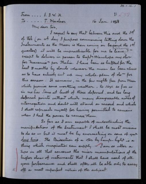 John Frederick William Herschel, Copy letter, from Sir John Herschel to Thomas Maclear, 16 January 1838, HS/21/239, The Royal Society Archives, London, https://makingscience.royalsociety.org/items/hs_21_239/copy-letter-from-sir-john-herschel-to-thomas-maclear, accessed on 08 December 2025