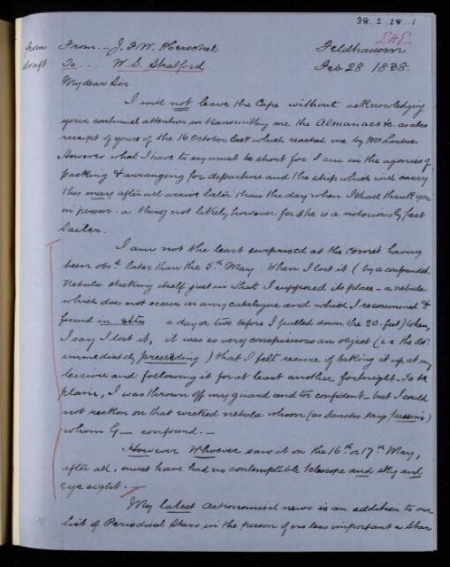 Copy of letter, from Sir John Herschel to William Samuel Stratford, dated at Feldhausen