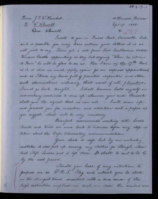 Copy letter, from Sir John Herschel to William Whewell, dated at 10 Hanover Terrace