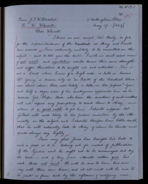 John Frederick William Herschel, Copy letter, from Sir John Herschel to William Whewell, dated at 17 Nottingham Mew, 17 May 1829, HS/21/47, The Royal Society Archives, London, https://makingscience.royalsociety.org/items/hs_21_47/copy-letter-from-sir-john-herschel-to-william-whewell-dated-at-17-nottingham-mew, accessed on 12 February 2026