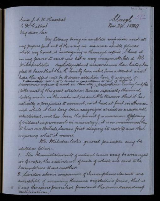 John Frederick William Herschel, Sir; John Frederick William Herschel, Copy letter, from Sir John Herschel to Davies Gilbert, dated at Slough, 24 November 1829, HS/21/52, The Royal Society Archives, London, https://makingscience.royalsociety.org/items/hs_21_52/copy-letter-from-sir-john-herschel-to-davies-gilbert-dated-at-slough, accessed on 14 November 2025