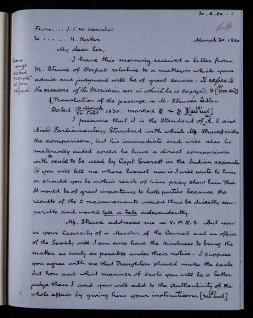 John Frederick William Herschel, Copy of incomplete letter, from Sir John Herschel to Henry Kater, 30 March 1830, HS/21/64, The Royal Society Archives, London, https://makingscience.royalsociety.org/items/hs_21_64/copy-of-incomplete-letter-from-sir-john-herschel-to-henry-kater, accessed on 15 February 2026