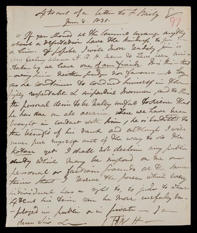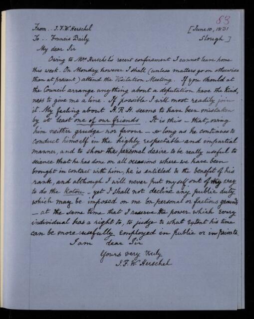 Copy of letter, copied as part of the correspondence project led by Colonel John Herschel FRS following the death of his father. His views on seeing Frederick Augustus (Duke of Sussex) about rooms for the Royal Astronomical Society, and the actions of the Duke.