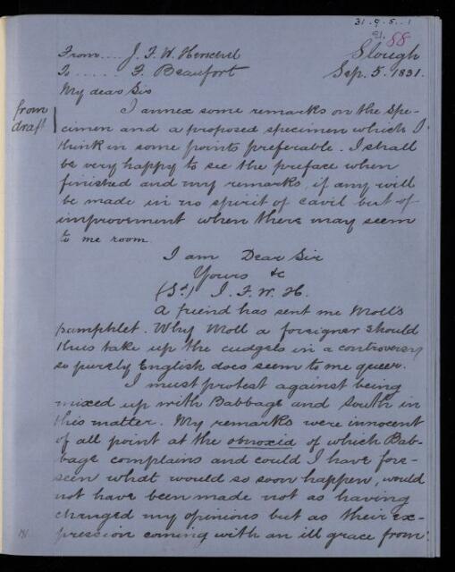 John Frederick William Herschel, Copy letter, from Sir John Herschel to Francis Beaufort, dated at Slough, 5 September 1831, HS/21/88, The Royal Society Archives, London, https://makingscience.royalsociety.org/items/hs_21_88/copy-letter-from-sir-john-herschel-to-francis-beaufort-dated-at-slough, accessed on 25 January 2026
