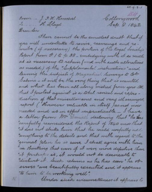 John Frederick William Herschel, Copy letter, from Sir John Herschel to Humphrey Lloyd, dated at Collingwood, 2 September 1842, HS/22/134, The Royal Society Archives, London, https://makingscience.royalsociety.org/items/hs_22_134/copy-letter-from-sir-john-herschel-to-humphrey-lloyd-dated-at-collingwood, accessed on 16 March 2026