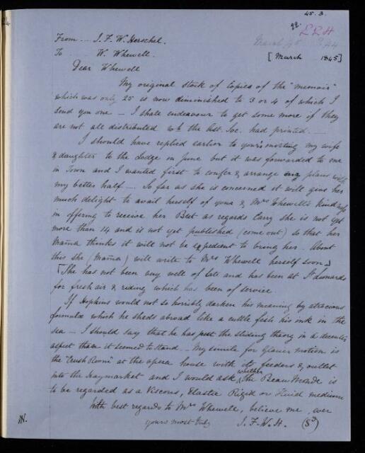 John Frederick William Herschel, Copy letter, from Sir John Herschel to William Whewell, March 1845, HS/22/224, The Royal Society Archives, London, https://makingscience.royalsociety.org/items/hs_22_224/copy-letter-from-sir-john-herschel-to-william-whewell, accessed on 12 February 2026