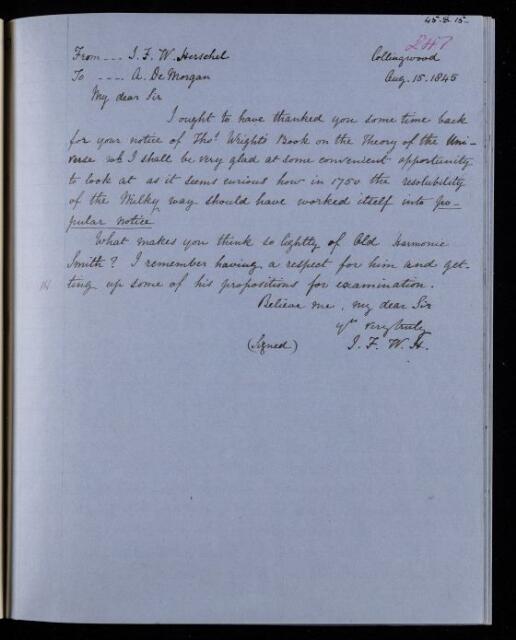John Frederick William Herschel, Copy letter, from Sir John Herschel to [Augustus] De Morgan, dated at Collingwood, 15 August 1845, HS/22/247, The Royal Society Archives, London, https://makingscience.royalsociety.org/items/hs_22_247/copy-letter-from-sir-john-herschel-to-augustus-de-morgan-dated-at-collingwood, accessed on 08 February 2026