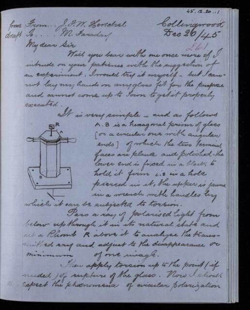 John Frederick William Herschel, Sir; John Frederick William Herschel, Copy of draft letter, from Sir John Herschel to Michael Faraday, dated at Collingwood, 20 December 1845, HS/22/261, The Royal Society Archives, London, https://makingscience.royalsociety.org/items/hs_22_261/copy-of-draft-letter-from-sir-john-herschel-to-michael-faraday-dated-at-collingwood, accessed on 16 November 2025