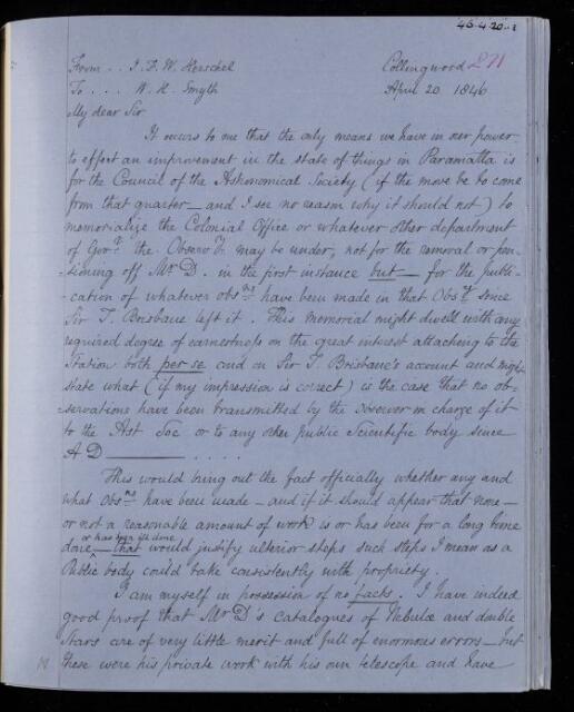 John Frederick William Herschel, Copy letter, from Sir John Herschel to William Henry Smyth, dated at Collingwood, 20 April 1846, HS/22/271, The Royal Society Archives, London, https://makingscience.royalsociety.org/items/hs_22_271/copy-letter-from-sir-john-herschel-to-william-henry-smyth-dated-at-collingwood, accessed on 14 March 2026
