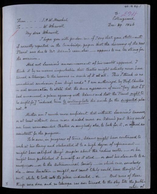 John Frederick William Herschel, Copy letter, from Sir John Herschel to William Whewell, dated at Collingwood, 29 December 1846, HS/22/294, The Royal Society Archives, London, https://makingscience.royalsociety.org/items/hs_22_294/copy-letter-from-sir-john-herschel-to-william-whewell-dated-at-collingwood, accessed on 12 February 2026