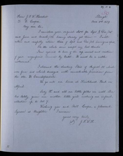 John Frederick William Herschel, Copy letter, from Sir John Herschel to Edward Joshua Cooper, dated at Slough, 2 November 1839, HS/22/30, The Royal Society Archives, London, https://makingscience.royalsociety.org/items/hs_22_30/copy-letter-from-sir-john-herschel-to-edward-joshua-cooper-dated-at-slough, accessed on 18 April 2026