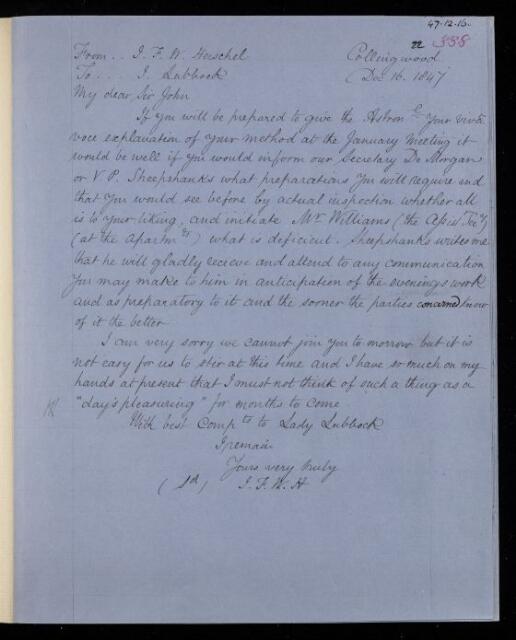 John Frederick William Herschel, Copy letter, from Sir John Herschel to John William Lubbock, dated at Collingwood, 16 December 1847, HS/22/338, The Royal Society Archives, London, https://makingscience.royalsociety.org/items/hs_22_338/copy-letter-from-sir-john-herschel-to-john-william-lubbock-dated-at-collingwood, accessed on 14 March 2026