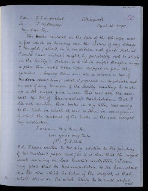 John Frederick William Herschel, Copy letter, from Sir John Herschel to [Thomas] Galloway, dated at Collingwood, 26 April 1840, HS/22/50, The Royal Society Archives, London, https://makingscience.royalsociety.org/items/hs_22_50/copy-letter-from-sir-john-herschel-to-thomas-galloway-dated-at-collingwood, accessed on 19 January 2026