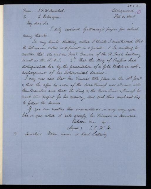 John Frederick William Herschel, Copy letter, from Sir John Herschel to Augustus De Morgan, dated at Collingwood, 3 February 1848, HS/23/10, The Royal Society Archives, London, https://makingscience.royalsociety.org/items/hs_23_10/copy-letter-from-sir-john-herschel-to-augustus-de-morgan-dated-at-collingwood, accessed on 13 December 2025