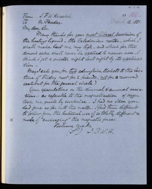 John Frederick William Herschel, Copy letter, from Sir John Herschel to Michael Faraday, 12 March 1851, HS/23/102, The Royal Society Archives, London, https://makingscience.royalsociety.org/items/hs_23_102/copy-letter-from-sir-john-herschel-to-michael-faraday, accessed on 12 December 2025