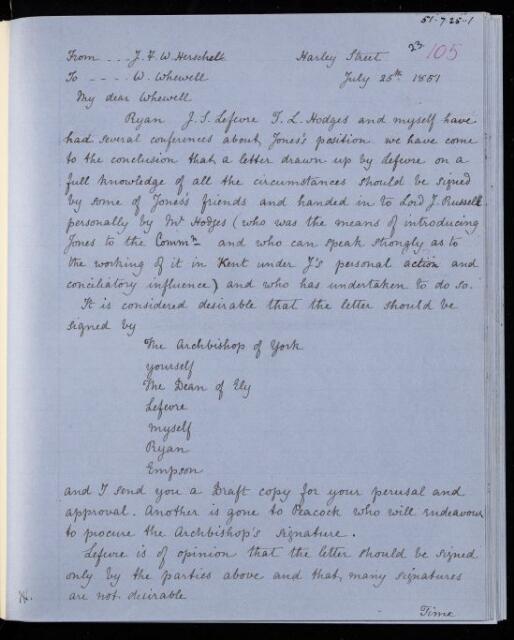 John Frederick William Herschel, Copy letter, from Sir John Herschel to William Whewell, dated at 32 Harley St., 25 July 1851, HS/23/105, The Royal Society Archives, London, https://makingscience.royalsociety.org/items/hs_23_105/copy-letter-from-sir-john-herschel-to-william-whewell-dated-at-32-harley-st, accessed on 13 January 2026