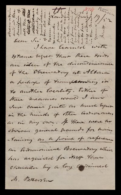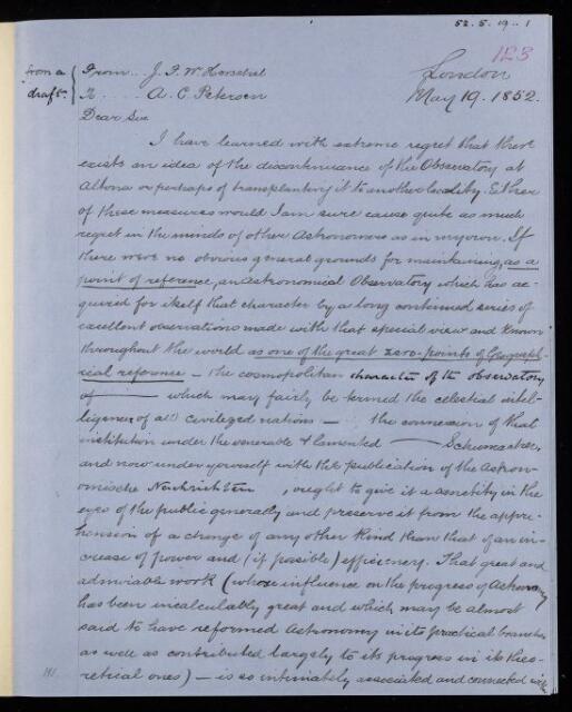 Draft letter, from Sir John Herschel to Adolph C. Petersen, dated at London