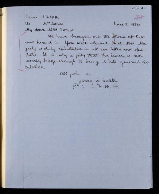 John Frederick William Herschel, Copy letter, from Sir John Herschel to Mrs. [Richard] Jones, 2 June 1854, HS/23/148, The Royal Society Archives, London, https://makingscience.royalsociety.org/items/hs_23_148/copy-letter-from-sir-john-herschel-to-mrs-richard-jones, accessed on 06 March 2026