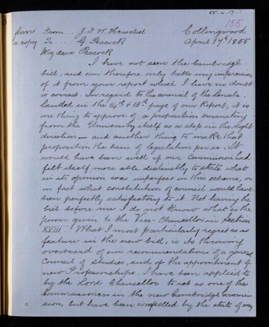 John Frederick William Herschel, Copy of draft letter, from Sir John Herschel to George Peacock, dated at Collingwood, 17 April 1855, HS/23/155, The Royal Society Archives, London, https://makingscience.royalsociety.org/items/hs_23_155/copy-of-draft-letter-from-sir-john-herschel-to-george-peacock-dated-at-collingwood, accessed on 19 January 2026